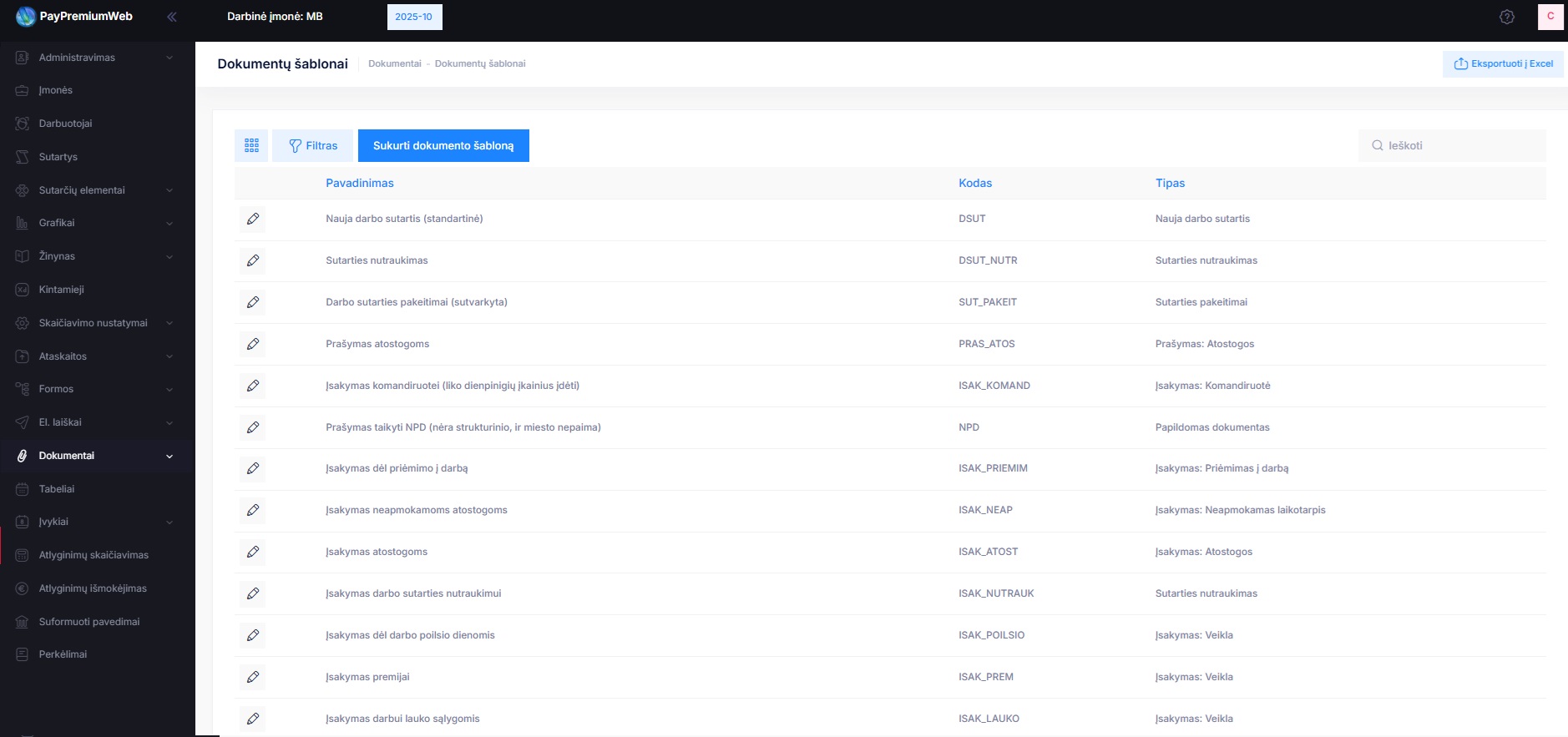 - Darbo sutarčių, įsakymų ir kt. dokumentų generavimas ir spausdinimas tiesiogiai iš programos.